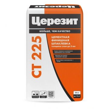Шпатлевка известковая Ceresit CT 225 эффективна при ремонте трещин, раковин и других дефектов глубиной до 3 мм. CT 225 выпускается белого и серого цвета. Для заполнения дефектов большего размера следует использовать ремонтную штукатурку Ceresit CT 29.